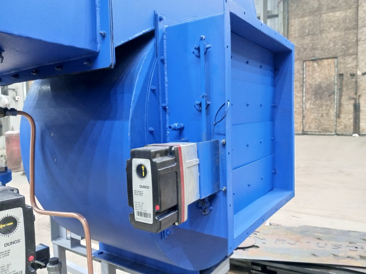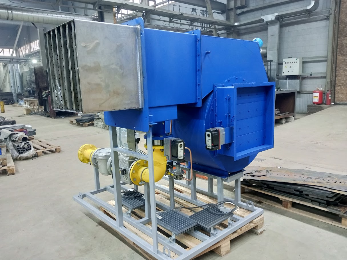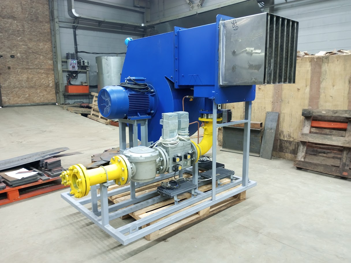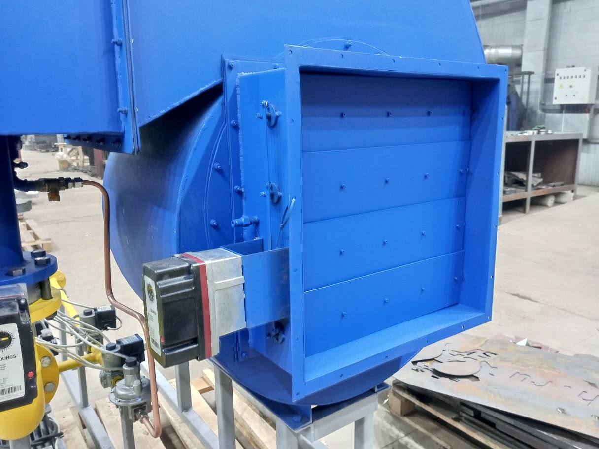 Газ через газовую арматуру поступает в газовый коллектор горелки, где происходит его распределение по пилонам. Воздух, нагнетаемый горелочным вентилятором 2, поступает в межпилонное пространство. На горелке предусмотрены ниппели для отбора импульсов давления газа и воздуха перед горелкой.