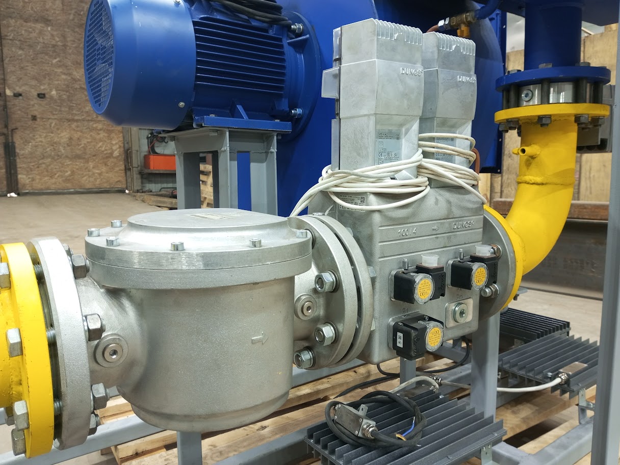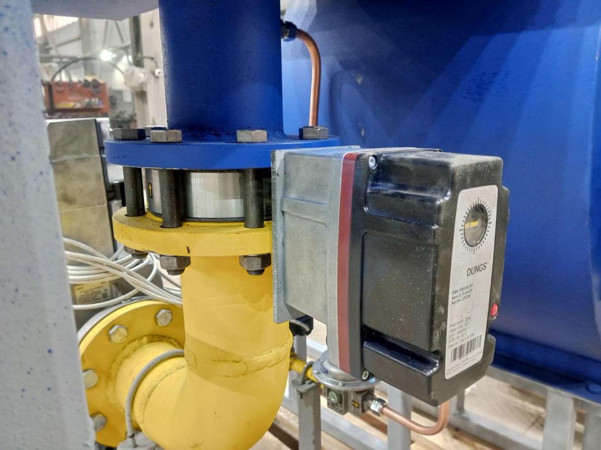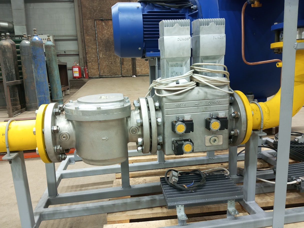 Горелка блочная состоит из горелки 1, дутьевого вентилятора 2, воздушной заслонки с приводом 3, газовой обвязки. В состав газовой обвязки входят фильтр 4, газовый мультиблок 5, газовая регулирующая заслонка 6, датчики давления газа 5.1, 5.2, 6.1, 6.2, клапан контроля герметичности 7, датчика контроля герметичности 8, клапан запальной горелки 9, стабилизатор давления газа запальной горелки, ручной кран расхода газа на запальник 10.